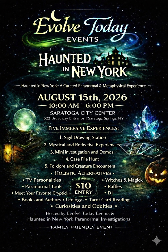 Haunted in New York: A Curated Paranormal and Metaphysical Experience-Step into a space where curiosity meets the unexplained. Haunted in New York brings together paranormal investigators, intuitive readers, spiritual healers, authors, artists, and unique makers for a full day of discovery. Wander through a marketplace filled with handcrafted tools, mystical creations, and interactive displays, then meet the teams who explore the region’s most intriguing hauntings. The event blends the excitement of the supernatural with the creativity of the metaphysical, offering something for seasoned enthusiasts and curious newcomers alike. Come explore, connect, and experience the energy of the unknown.