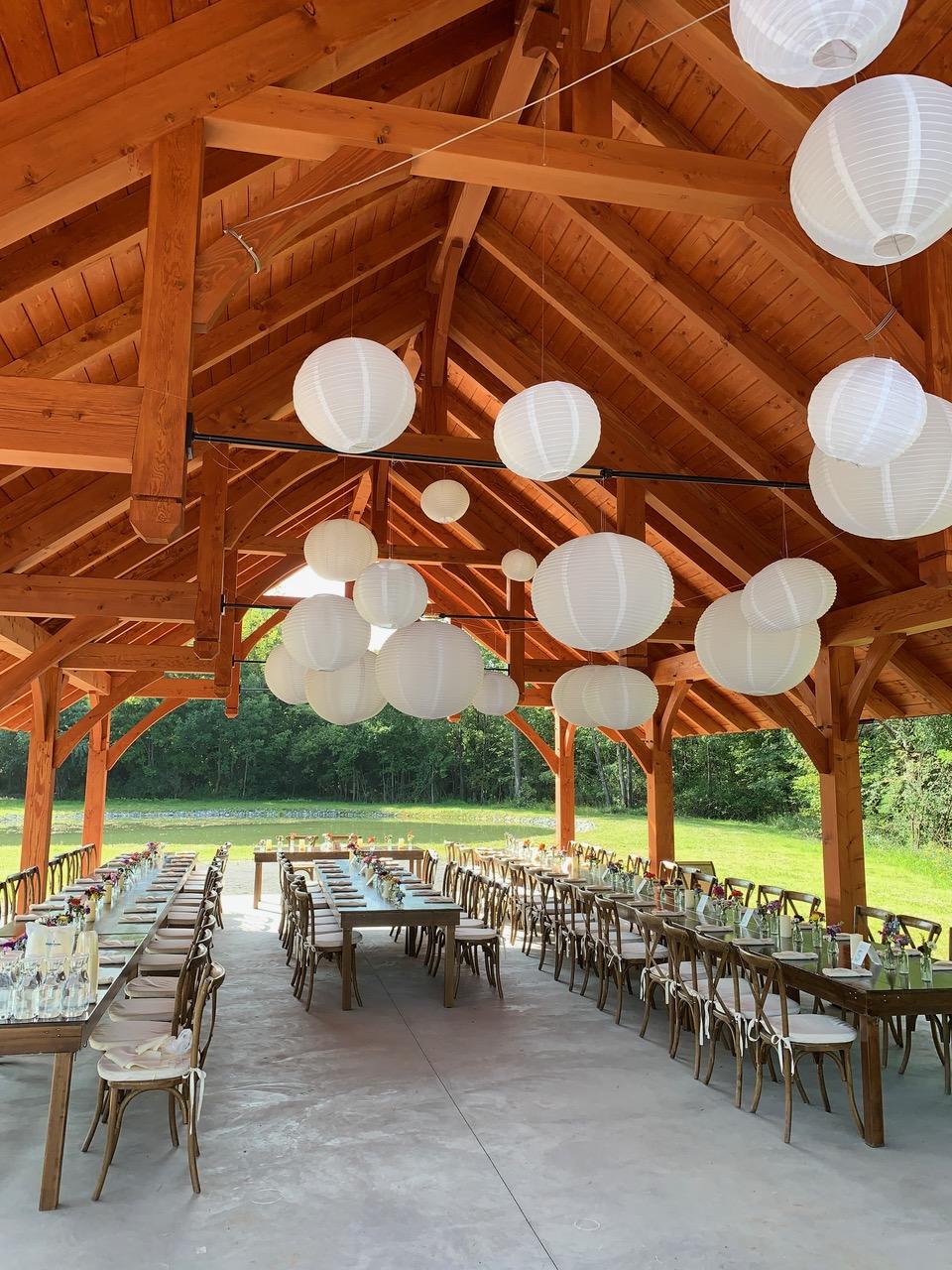 The Nicholas J. Juried Meeting House indoor space paired with their incredible timber frame pavilion have become a favorite of area couples. Rental for weddings includes the day before for set up and rehearsal, the day of the wedding, and the morning after to complete cleanup, if needed. Rental season runs from May 1st to October 31st.